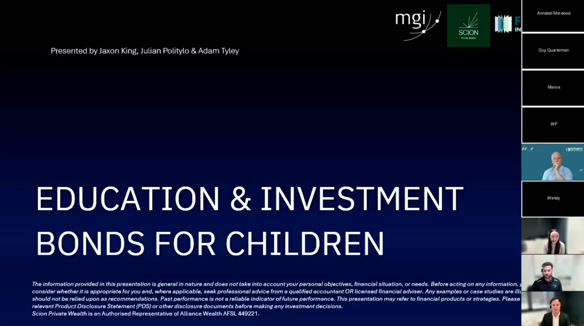 Topic: Education and investment bonds for children, featuring three experts discussing strategic approaches to funding education costs. The session covers education funding strategies using tax-effective structures, intergenerational wealth transfer methods, and non-estate asset planning.